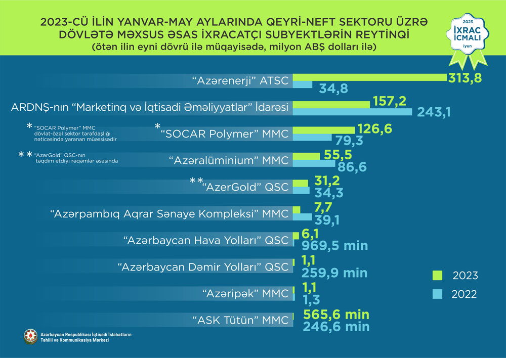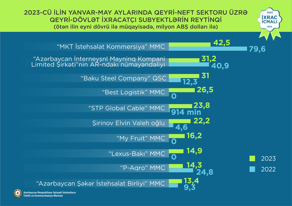 2023-cü ilin yanvar-may ayları üzrə hazırlanan qeyri-dövlət ixracatçı subyektlərin reytinqində ilk onluqda aşağıdakı şirkətlər təmsil olunurlar: “MKT İstehsalat Kommersiya” MMC, “Azərbaycan İnterneyşnl Mayninq Kompani Limited Şirkəti”nin Azərbaycan Respublikasındakı Nümayəndəliyi, “Baku Steel Company” QSC, “Best Logistik” MMC, “STP Global Cable” MMC, Şirinov Elvin Valeh oğlu, “My Fruit” MMC, “Lexus-Bakı” MMC, “P-Aqro” MMC, “Azərbaycan Şəkər İstehsalat Birliyi” MMC.