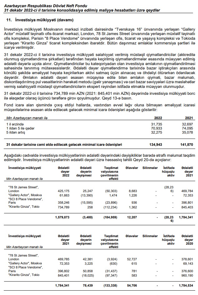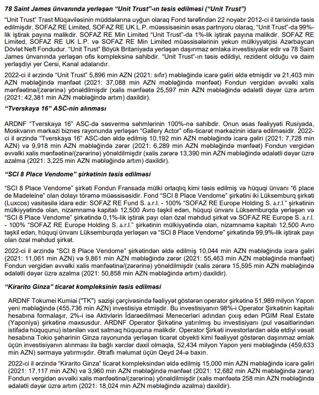 "Daşınmaz əmlaka birbaşa investisiyalar Birbaşa investisiyalar Moskva, London, Paris və Tokio şəhərlərində yerləşən dörd əmlak olmaqla bizim daşınmaz əmlak portfelimizin 21%-ni təşkil edir. Hər bir əmlakımız illik əsasda müstəqil olaraq qiymətləndirilir. Aşağıdakı cədvəldə birbaşa investisiya etdiyimiz daşınmaz əmlakların 2021 və 2022-ci illər üzrə qiymətləndirmə nəticələri və müvafiq qiymətləndirici şirkətlər qeyd olunmuşdur".