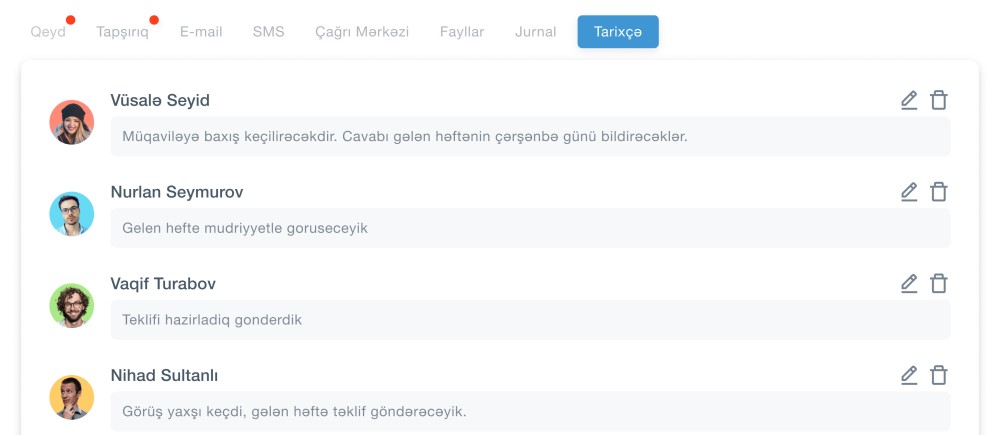 Müştəri haqqında məlumatların əks etdirilməsi, habelə müştəri ilə aparılan bütün danışıqlar və təqdim edilən bütün qiymət təklifləri Cubics BMS sistemində müştəri tarixçəsi bölümündə əks etdirilir.
