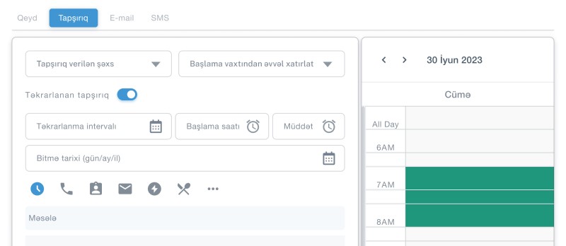 Müştərilər ilə görüş vaxtlarını doğru planlamaq, xatırlatma üçün zəng etmək, email yazmaq və s. kimi işlər çox asanlıqla Cubics BMS Tapşırıqlar modulu ilə idarə edilir.
