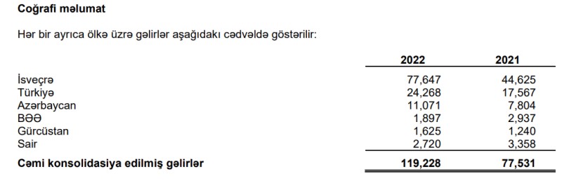 Marja.az Azərbaycanın ən böyük şirkəti olan SOCARı-ın 31 dekabr 2022-ci il tarixində başa çatan il üzrə konsolidasiya edilmiş hesabatına istinadən xəbər verir ki, ötən il Şirkətin İsveçrədə gəlirləri 33 milyard 22 milyon manat və ya 74%, Türkiyədə 6 milyard 701 milyon manat və ya 38%, Azərbaycanda 3 milyard 267 milyon manat və ya 41,8%, Gürcüstanda 385 milyon manat və ya 31% artıb, Birləşmiş Ərəb Əmirliklərində 1 milyard 40 milyon manat və ya 54,8%, digər ölkələrdə isə 638 milyon manat və ya 19% azalıb.
