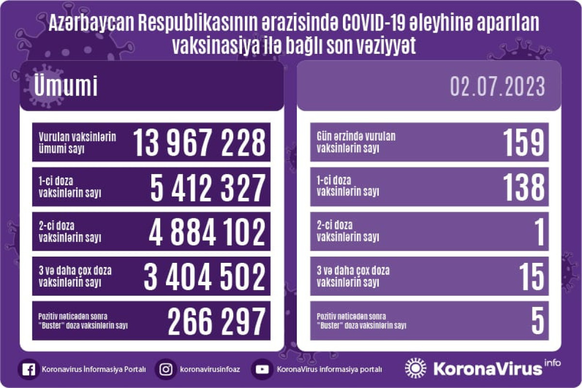 Azərbaycanda son sutkada koronavirus (COVID-19) əleyhinə 159 vaksin vurulub. Bir gündə birinci mərhələ üzrə vaksinasiya olunanların sayı 138, ikinci mərhələ üzrə vaksinasiya olunanların sayı 1, üç və daha çox doza üzrə vaksinasiya olunanların sayı 15, pozitiv nəticədən sonra buster doza üzrə vaksinasiya olunanların sayı 5 nəfərdir.