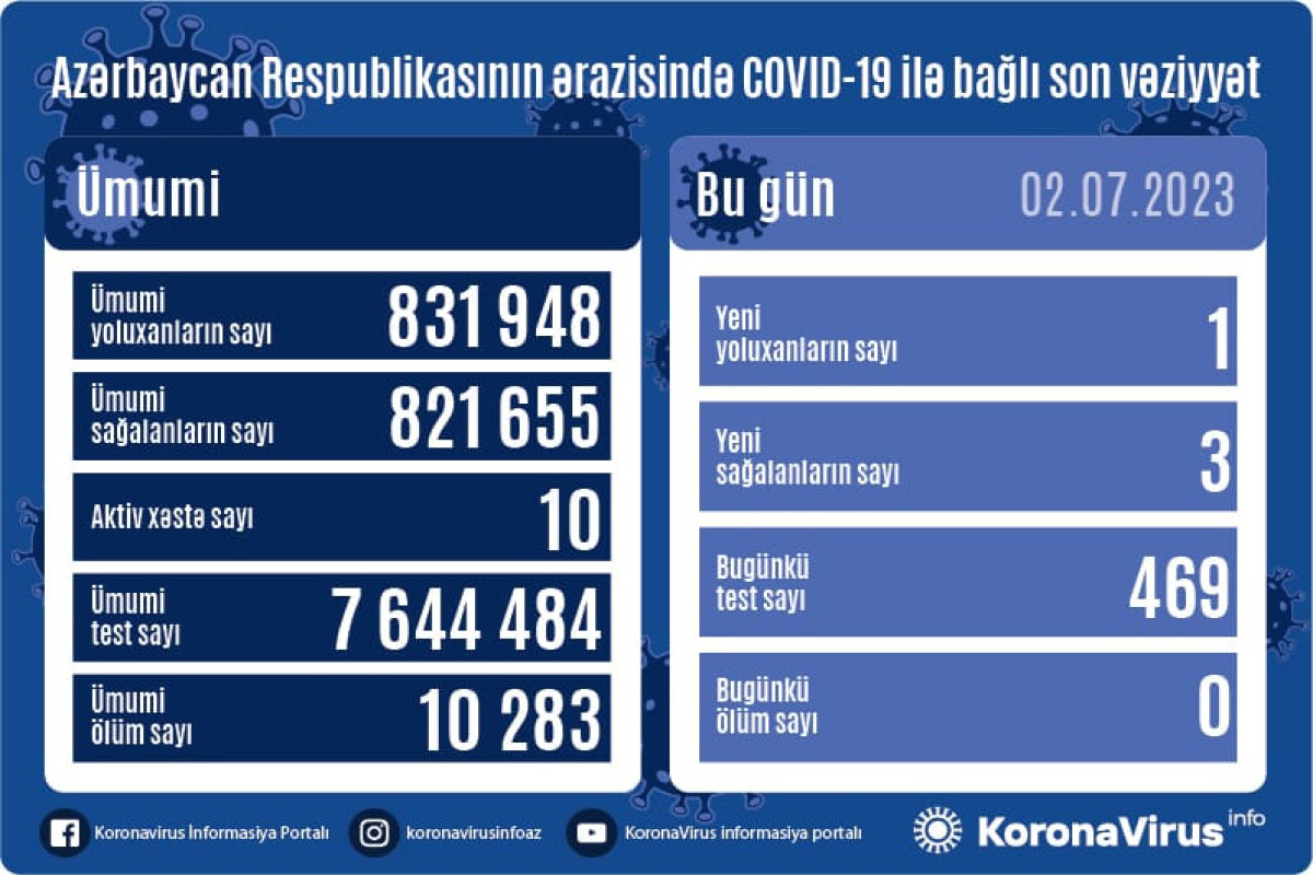 Azərbaycan Respublikasında koronavirus (COVID-19) infeksiyasına 1 yeni yoluxma faktı qeydə alınıb, 3 nəfər müalicə olunaraq sağalıb.