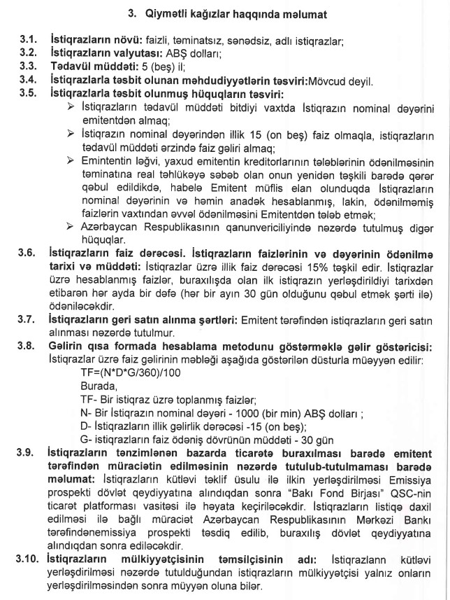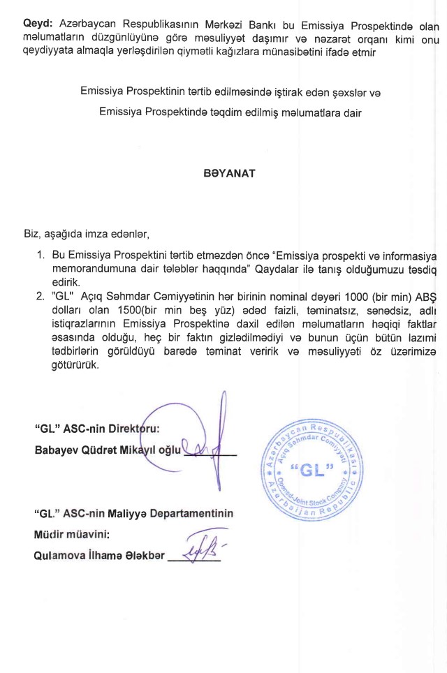Xəbər verdiyimiz kimi, "GL" ASC 1,5 milyon dollarlıq istiqraz buraxıb. Şirkət hər birinin nominal dəyəri 1 000 ABŞ dolları olan 1500 ədəd faizli, təminatsız, sənədsiz, adlı istiqrazlar təklif edəcək. İstiqrazlar üzrə tədavül müddəti 5 il, illik faiz dərəcəsi 15%-dir. Yerləşdirmənin anderrayeteri "İnvest-AZ İnvestisiya Şirkəti" QSC-dir.