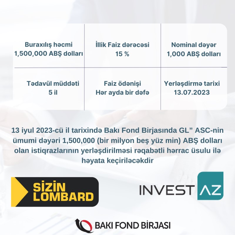 Qeyd edilib ki, 13 iyul 2023-cü il tarixində Bakı Fond Birjasında “GL” ASC-nin ümumi dəyəri 1 milyon 500 min ABŞ dolları olan istiqrazlarının yerləşdirilməsi rəqabətli hərrac üsulu ilə həyata keçiriləcəkdir.