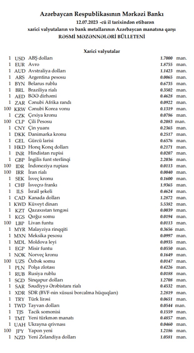Dolların bazar ertəsi üçün rəsmi məzənnəsi müəyyən olunub