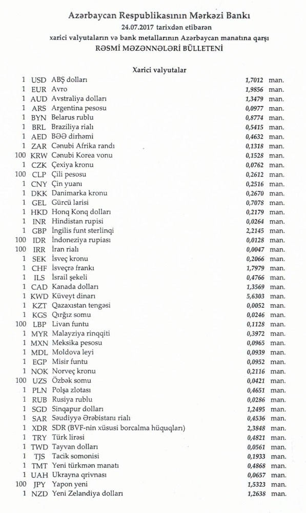 İyulun 24-nə Mərkəzi Bankın açıqladığı rəsmi Dollar/manat məzənnəsi İyulun 21-i ilə müqayisədə dəyişməyərək 1,7012 manat olub, Avro/manat məzənnəsi isə 1.9856 manata qalxıb.