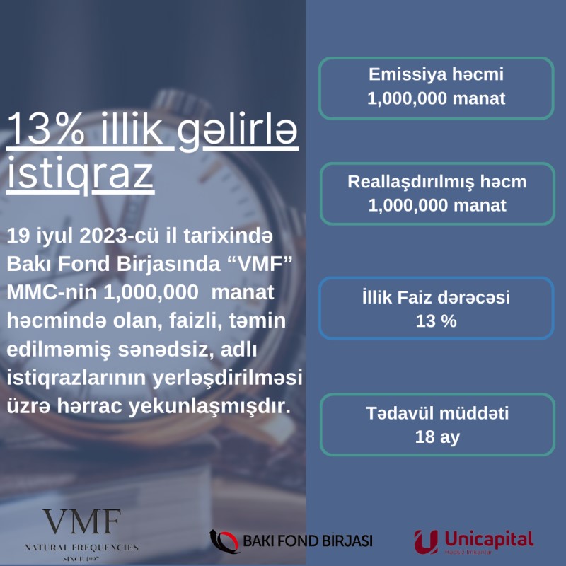Bakı Fond Birjasının da yaydığı məlumatda bildirilir ki, 19 iyul 2023-cü il tarixində Bakı Fond Birjasında “VMF” MMC-nin tədavül müddəti 18 ay, nominal dəyəri 100 manat olan AZ2001025488 dövlət qeydiyyat nömrəli 1 milyon manat həcmində olan, faizli, təmin edilməmiş sənədsiz, adlı istiqrazlarının yerləşdirilməsi üzrə birqiymətli hərrac yekunlaşıb.