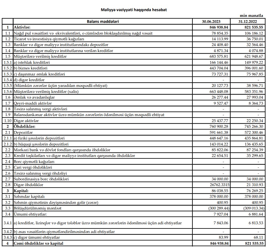 "Yelo Bank"ın kredit portfeli 2022-ci ilin sonu ilə müqayisədə 61 milyon 627 min manat və ya 9,9% aratarq 30 iyun 2023-cü il tarixində 683 milyon 576 min manat təşkil edib.
