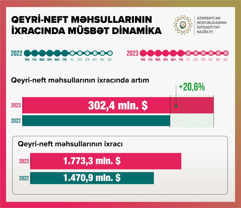Qeyri-neft sektorunun ixrac imkanlarının artırılması istiqamətində həyata keçirilən tədbirlər nəticəsində bu ilin yanvar-iyun aylarında qeyri-neft məhsullarının ixracı əvvəlki ilin müvafiq dövrünə nisbətən 20,6% artaraq 1 milyard 773,3 milyon dollar təşkil edib.