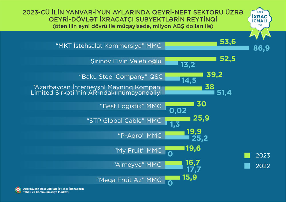 Şirinov Elvin Valeh oğlu 2023-cü ilin yanvar-iyun ayları üzrə qeyri-dövlət ixracatçı subyektlərin reytinqində 2-ci yeri tutub.
