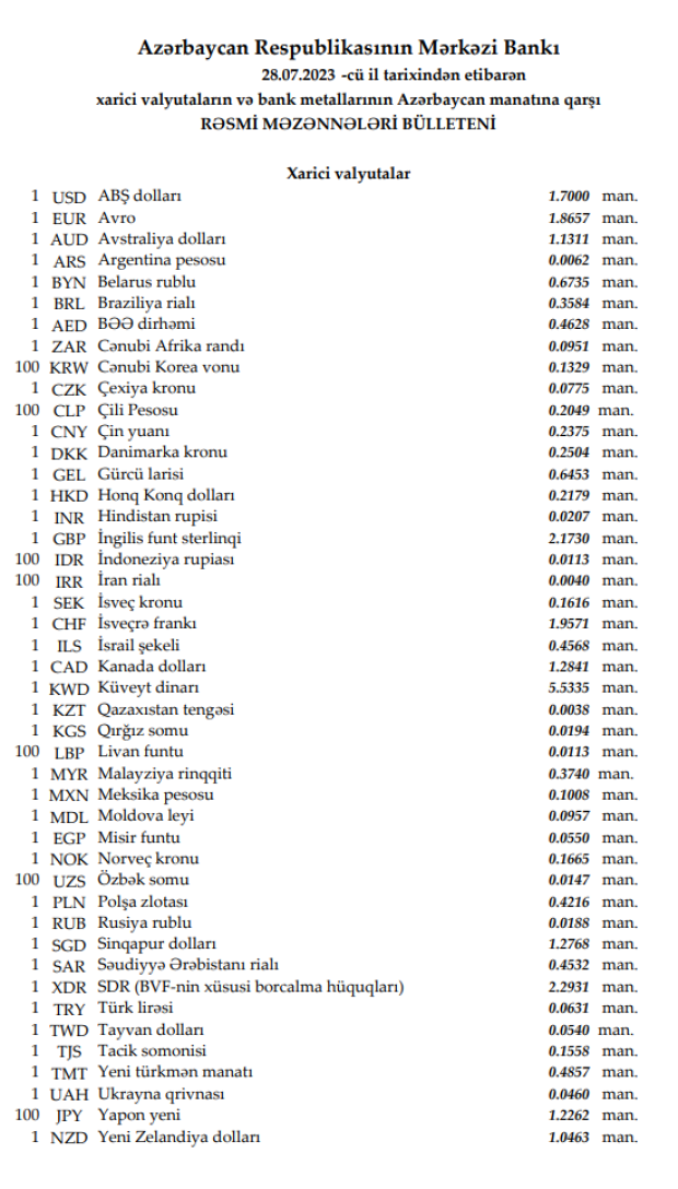 Rəsmi məzənnələr açıqlandı