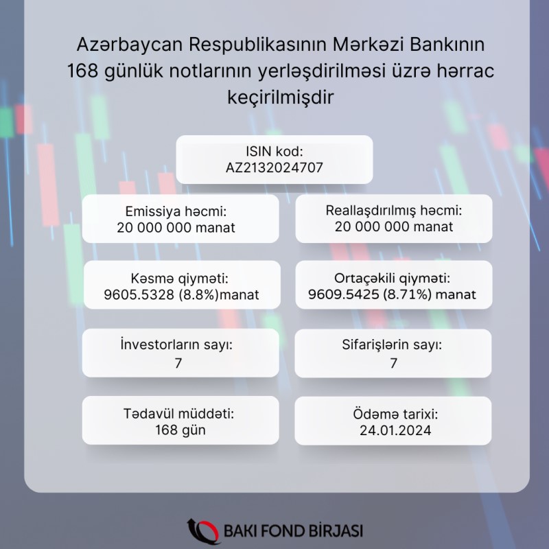 9 avqust 2023-cü il tarixində Bakı Fond Birjasında Azərbaycan Respublikasının Mərkəzi Bankının (ARMB) AZ2132024707 dövlət qeydiyyat nömrəli 20 milyon manat həcmində 168 gün tədavül müddətli notlarının yerləşdirilməsi üzrə hərrac keçirilib.