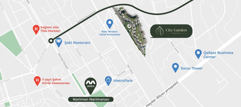 Coğrafi olaraq Bakının mərkəzində yerləşən “City Garden Narimanov” Heydər Əliyev prospektinin yaxınlığında, Nəriman Nərimanov metrostansiyasına qısa məsafədədir. Kompleksə Şəki dairəsindən də yol çəkilir. Bununla da siz şəhərin bütün istiqamətlərindən evinizə daha rahat və tez çatacaqsız.