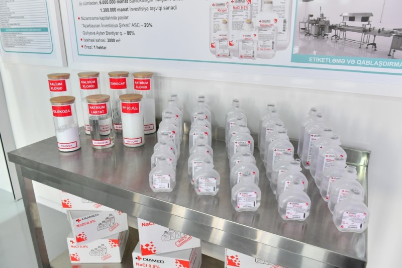 İstehsal prosesi ilə yaxından tanış olan Azərbaycan Prezidentinə məlumat verilib ki, zavodda müxtəlif adlarda, geniş çeşiddə (NaCl 0,9 faiz; Ringer; Ringer laktat; Qlükoza və s.) və müxtəlif həcmlərdə (100 ml, 200 ml, 250 ml, 400 ml, 500 ml) həyati vacib və zəruri venadaxili dərman məhlulları istehsal olunacaq.
