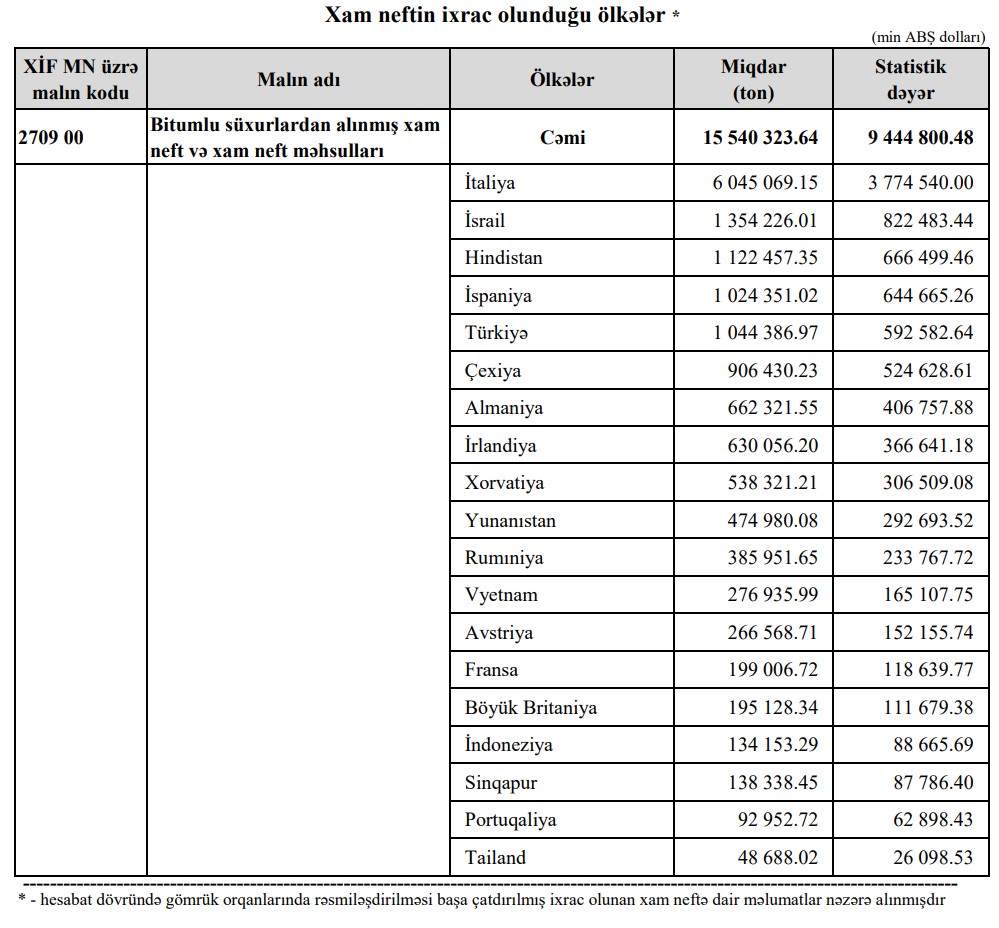 Marja.az Dövlət Gömrük Komitəsinin 2023-cü ilin yanvar-iyul dövrü üzrə hesabatına istinadən xəbər verir ki, Azərbaycandan ən çox xam neft alan ölkələr İtaliya, İsrail, Hindistan, İspaniya və Türkiyədir.