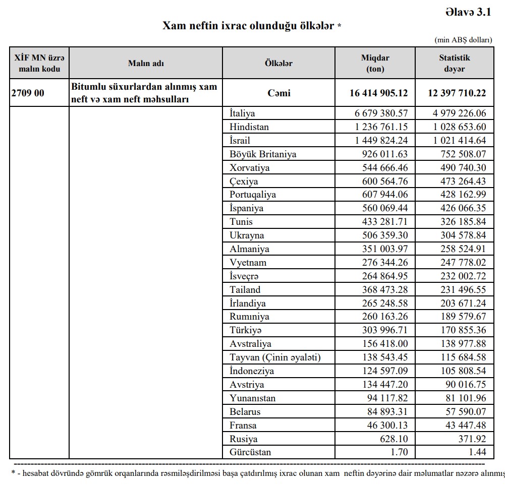 Dövlət Gömrük Komitəsi Azərbaycan xam neftinin ixrac olunduğu ölkələri açıqlayıb.