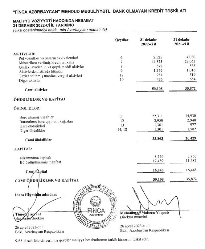 "Finca Azerbaijan" 2023-də də mənfəətlə fəaliyyət göstərir, kredit portfeli böyüyüb