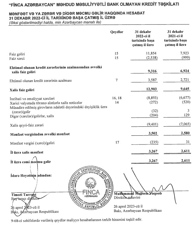 Əhalinin və biznesin "Finca Azerbaijan"a borcu artıb."Finca Azerbaijan" Qeyri-Bank Kredit Təşkilatı 2023-cü ilin birinci yarısını (yanvar-iyun) 840 min manat xalis mənfəət ilə başa vurub. Xatırladaq ki, Təşkilat 2022-ci ili 3 milyon 267 min manat, 2021-ci ili isə 2 milyon 611 min manat xalis mənfəət ilə bağlamışdı.
