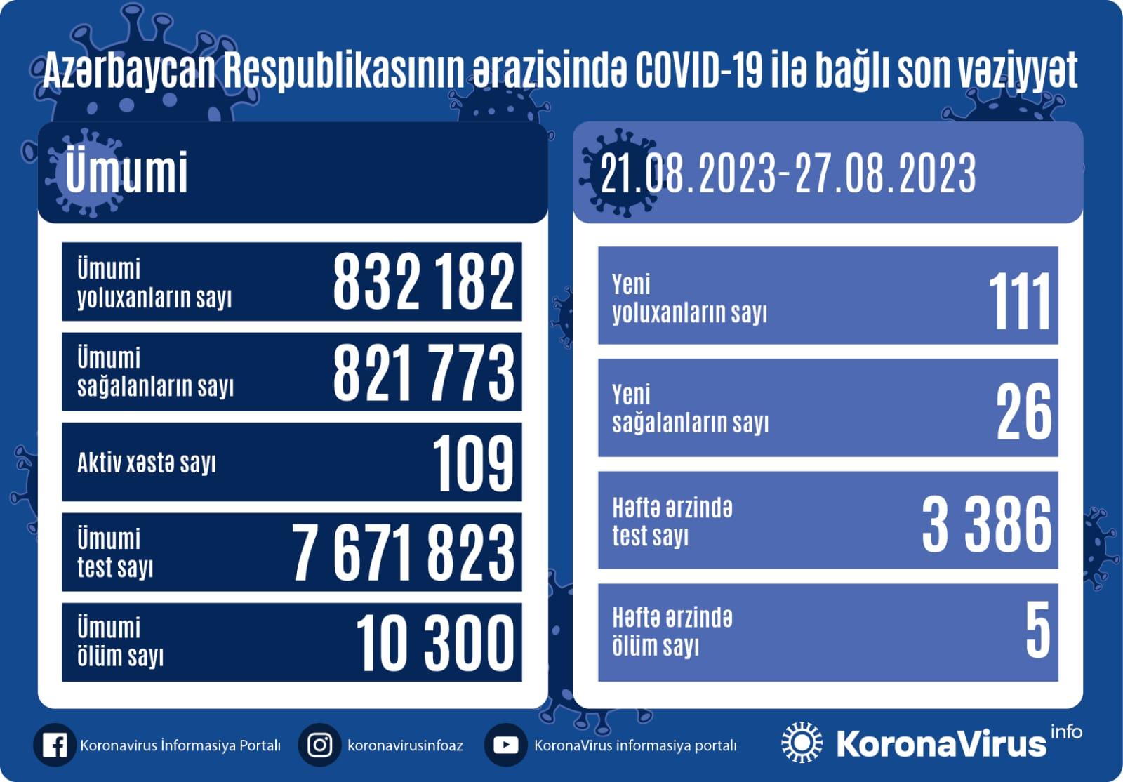 COVID-19-a yoluxan 26 nəfər sağalıb. Həftə ərzində analiz cavabı müsbət çıxan 5 nəfər ölüb.