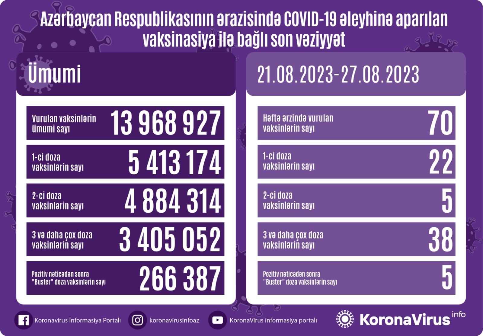 Azərbaycanda bu günə qədər vurulan vaksinlərin ümumi sayı isə 13 968 927 olub.