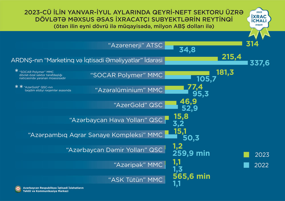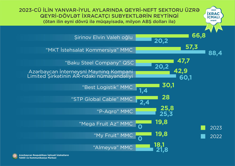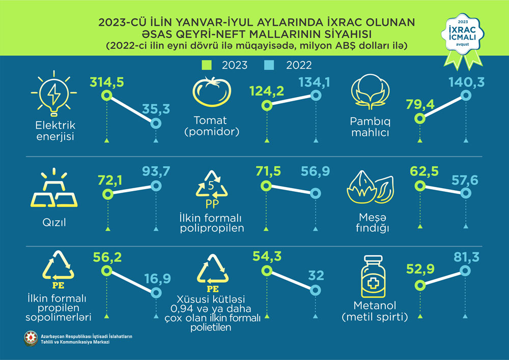 2023-cü ilin yanvar-iyul ayları ərzində ixrac edilən qeyri-neft sektoruna aid malların siyahısında elektrik enerjisi (314,5 milyon ABŞ dolları) birinci olub. Bu siyahıda pomidor (tomat) (124,2 milyon ABŞ dolları) ikinci, pambıq mahlıcı (79,4 milyon ABŞ dolları) isə üçüncü yerdə qərarlaşıb.