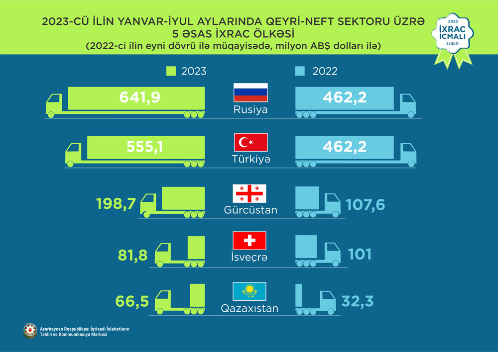 2023-cü ilin yanvar-iyul ayları ərzində Rusiya Federasiyasına 641,9 milyon ABŞ dolları, Türkiyəyə 555,1 milyon ABŞ dolları, Gürcüstana 198,7 milyon ABŞ dolları,İsveçrə Konfederasiyasına 81,8 milyon ABŞ dolları, Qazaxıstana isə 66,5 milyon ABŞ dolları dəyərində qeyri-neft sektoruna aid mal ixrac olunub.