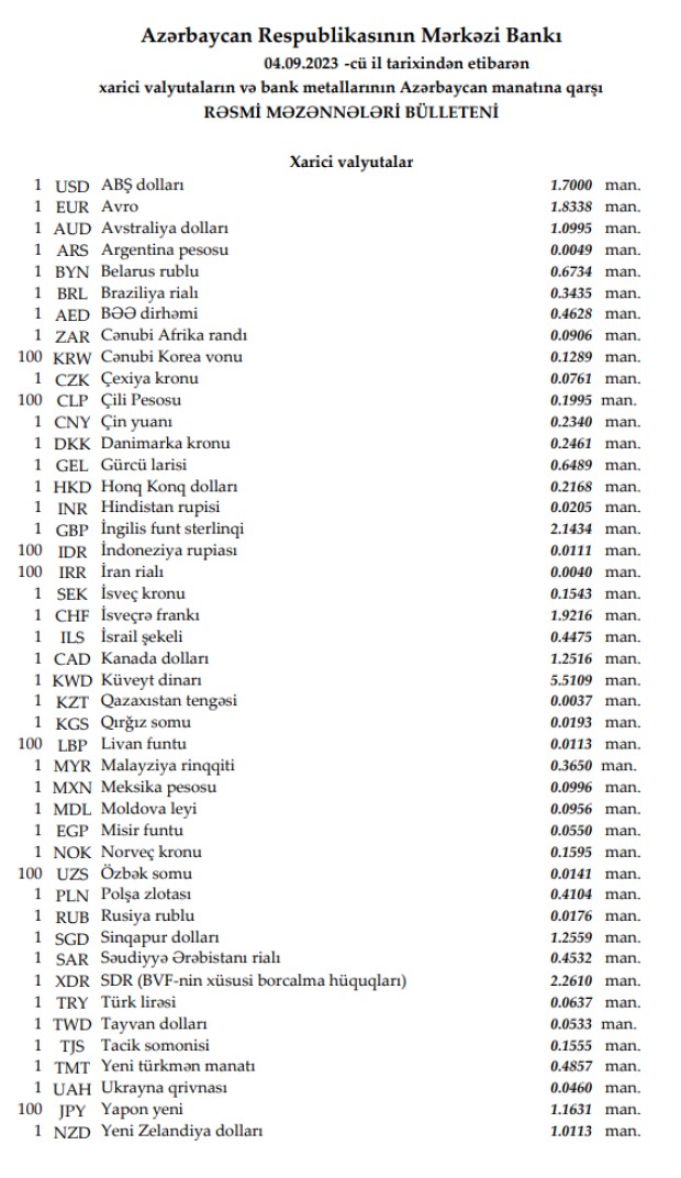 Dolların bazar ertəsi üçün rəsmi məzənnəsi müəyyən olunub