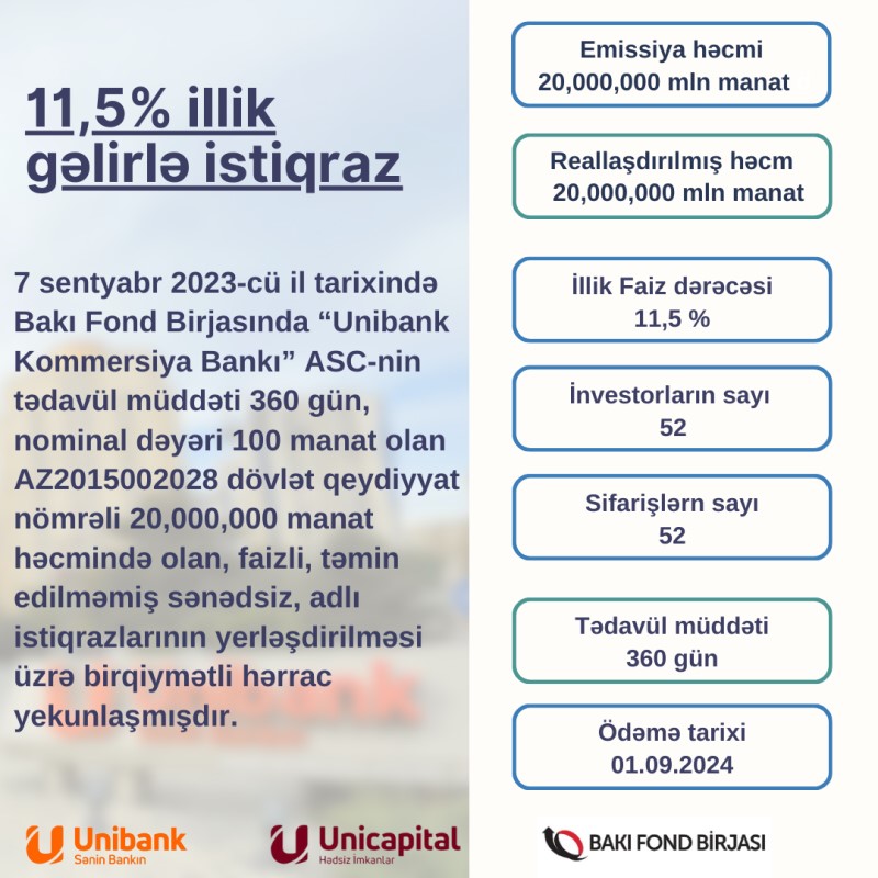 7 sentyabr 2023-cü il tarixində Bakı Fond Birjasında “Unibank Kommersiya Bankı” ASC-nin tədavül müddəti 360 gün, nominal dəyəri 100 manat olan AZ2015002028 dövlət qeydiyyat nömrəli 20 milyon manat həcmində olan, faizli, təmin edilməmiş sənədsiz, adlı istiqrazlarının yerləşdirilməsi üzrə birqiymətli hərrac yekunlaşıb.