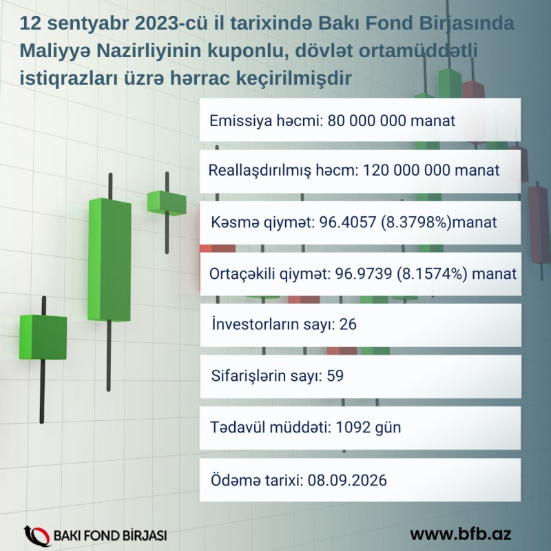 12 sentyabr 2023-cü il tarixində Bakı Fond Birjasında Azərbaycan Respublikası Maliyyə Nazirliyinin AZ0201040232 ISIN-li, 80 milyon manat həcmində, 1092 gün olan tədavül müddətli Kuponlu, Dövlət Ortamüddətli İstiqrazlarının (DOİ) yerləşdirilməsi üzrə hərrac keçirilib.