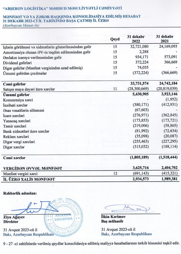 Marja.az Şirkətin maliyyə hesabatına istinadən xəbər verir ki, "Abşeron Logistika" MMC-nin cəmi gəlirləri 2021-ci ildə 24 milyon 742 min manat ikən, 2022-ci ildə 33 milyon 732 min manata yüksəlib ( 8 milyon 990 min manat və ya 36,3% artıb).