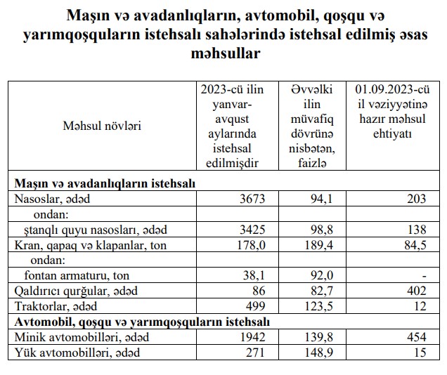 2023-сü ilin yanvar-avqust aylarında Azərbaycanda 1942 ədəd və ya əvvəlki ilin müvafiq dövrü ilə müqayisədə 553 ədəd çox (39,8 faiz çox) minik avtomobili istehsal olunub (yığılıb).