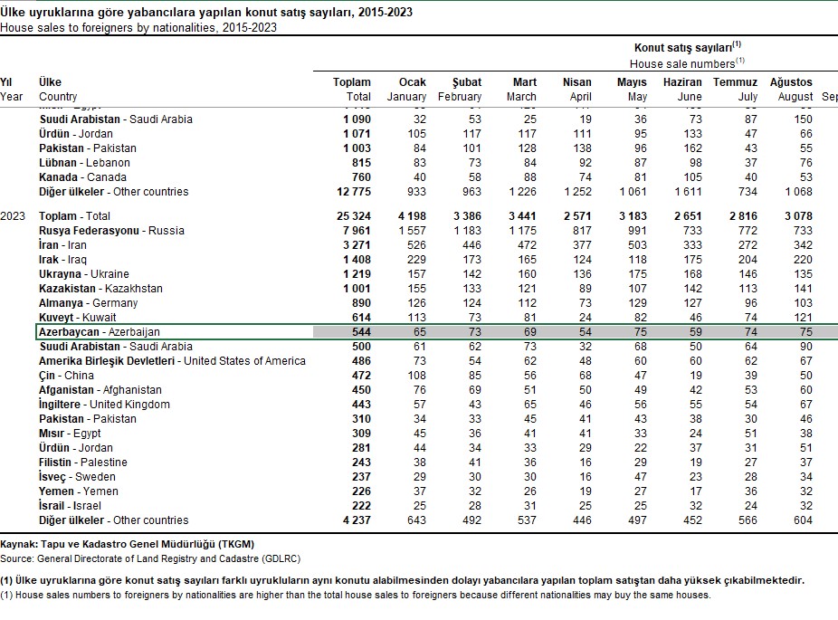 2023-cü ilin 8 ayı ərzində (yanvar-avqust) Azərbaycan vətəndaşları Türkiyədə 544 ev alıblar. Bu say ötən ilin 8 ayında 873 idi.