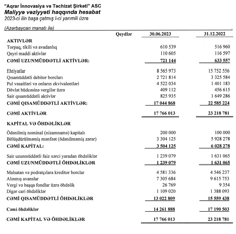 30 İyun 2023-cü il tarixində "Aqrar İnnovasiya və Təchizat Şirkəti" ASC 17 milyon 766 min manat cəmi aktivlərə mlaik olub.