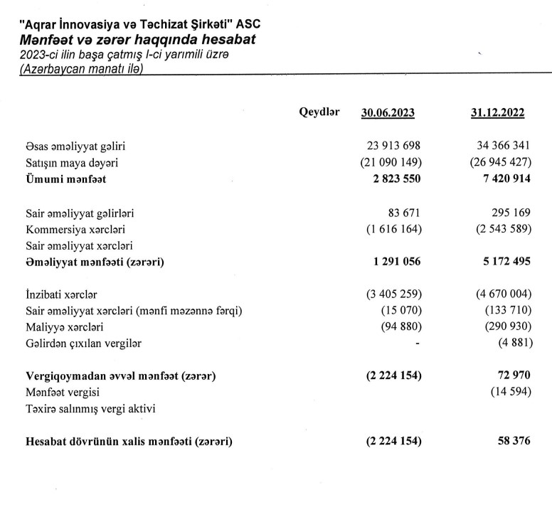 Satışın maya dəyəri, kommersiya və inzibati xərclər artdığından "Aqrar İnnovasiya və Təchizat Şirkəti" ASC ilk 6 ayı 2 milyon 224 min manat xalis zərər ilə başa vurub.