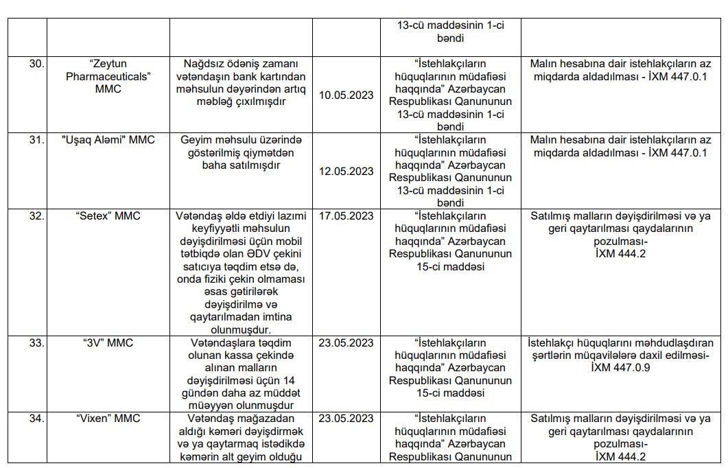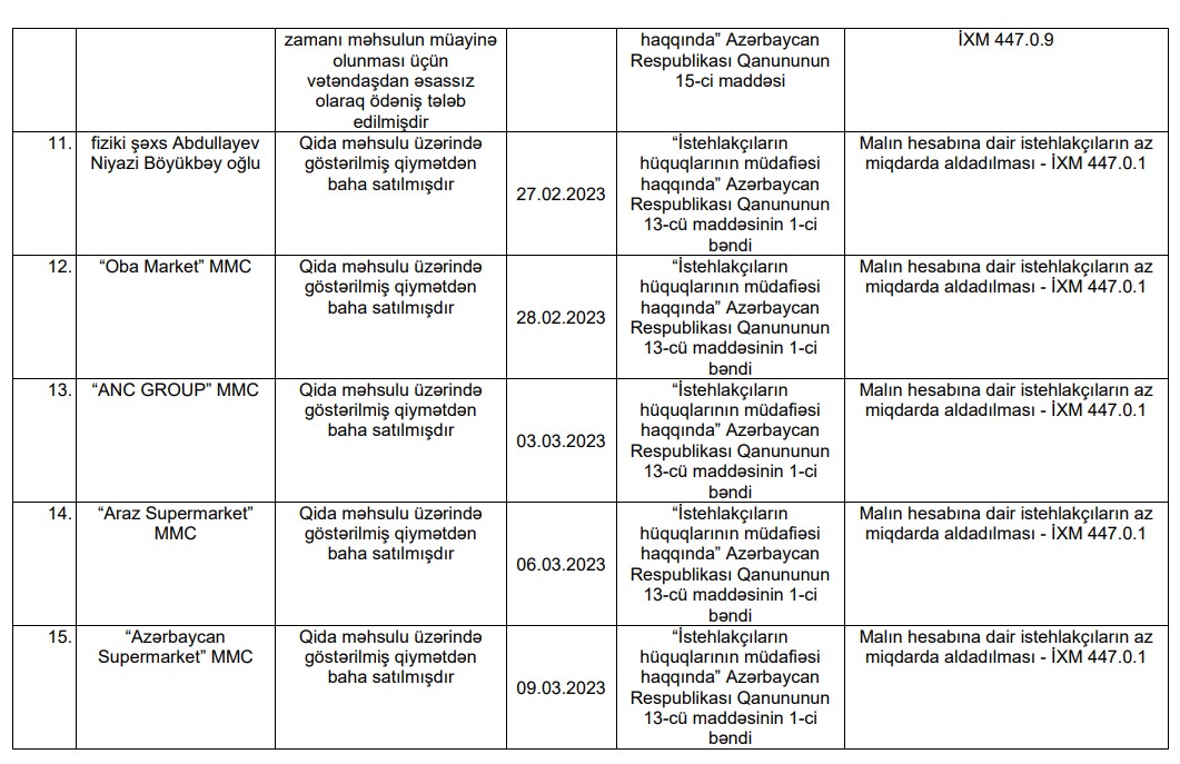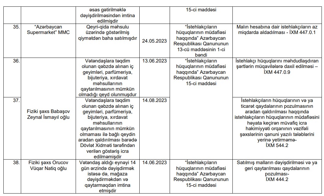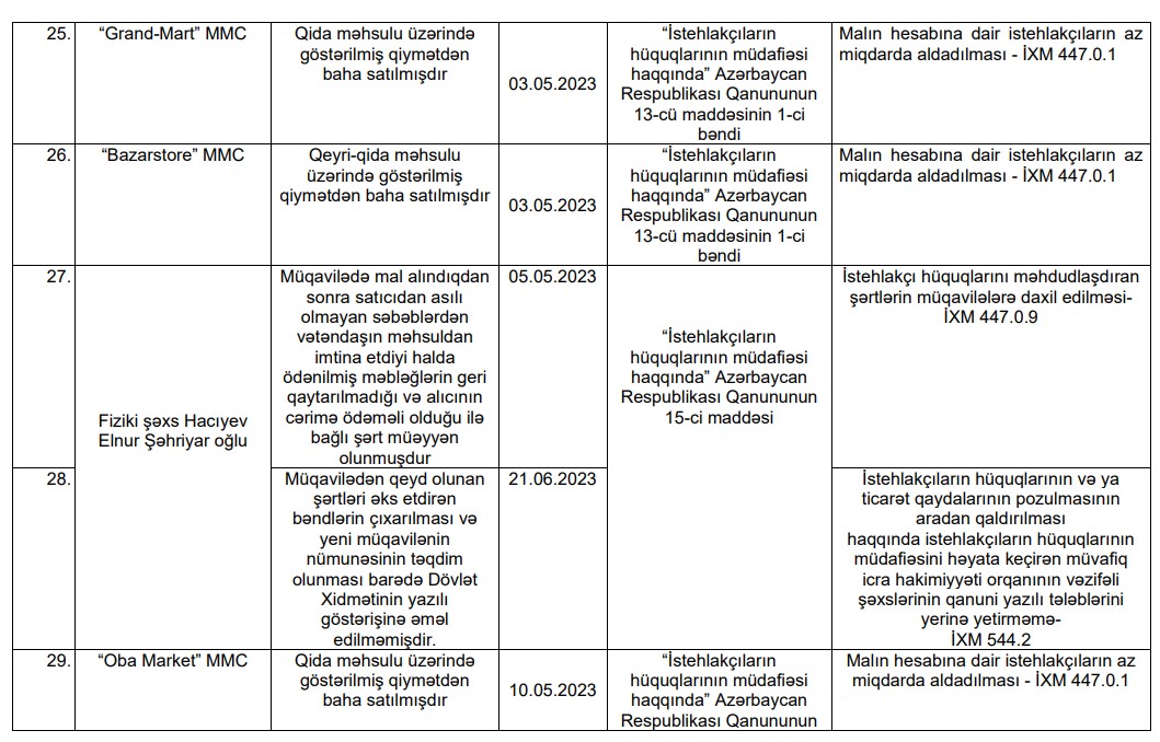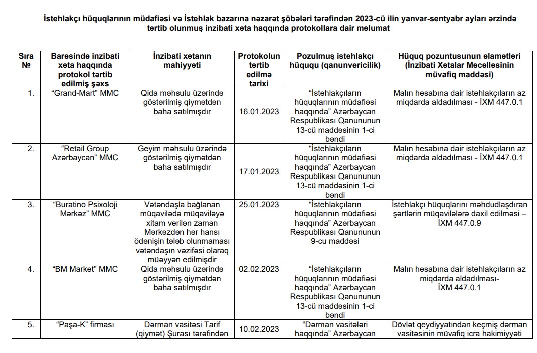 İstehlakçı hüquqlarının müdafiəsi və istehlak bazarına nəzarət sahəsində sahibkarlıq fəaliyyəti ilə məşğul olan fiziki və hüquqi şəxslər barədə tərtib olunmuş protokollara dair ətraflı məlumat: