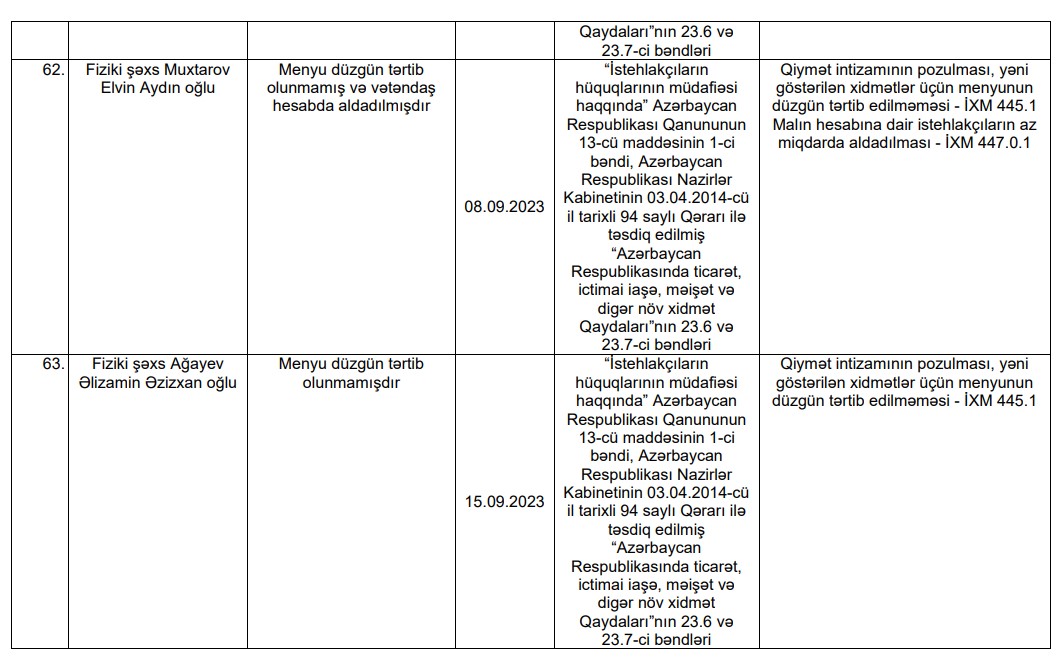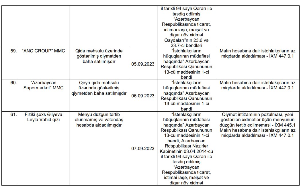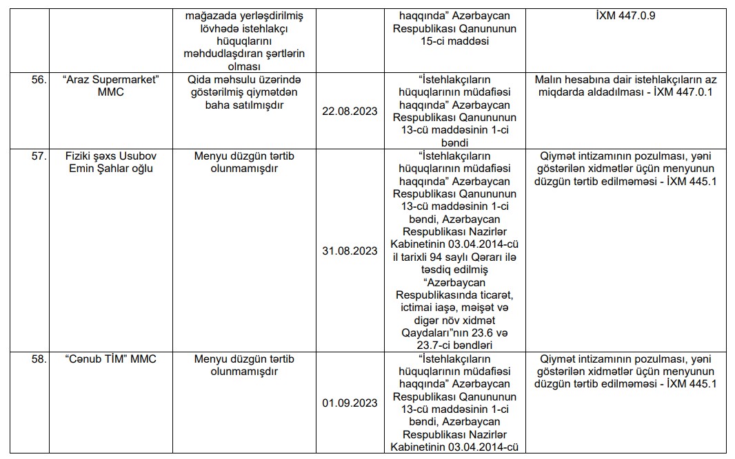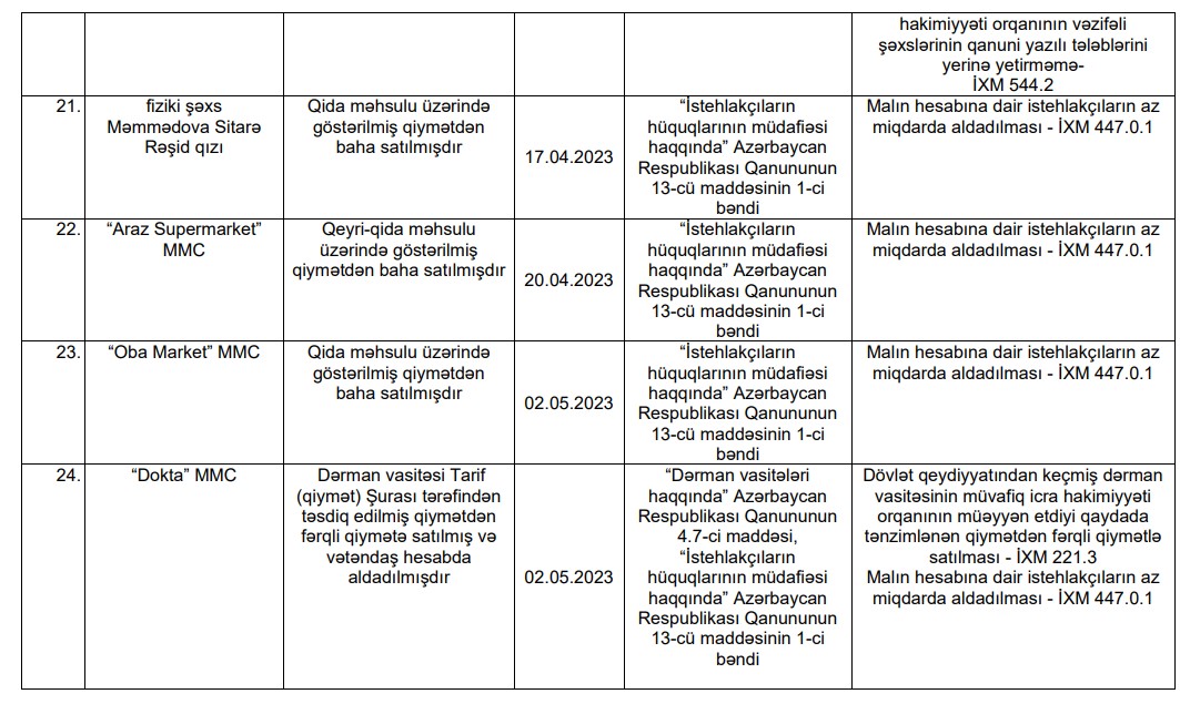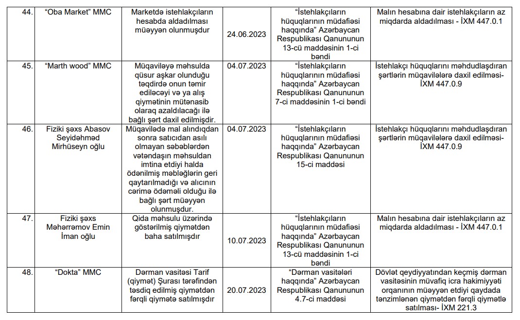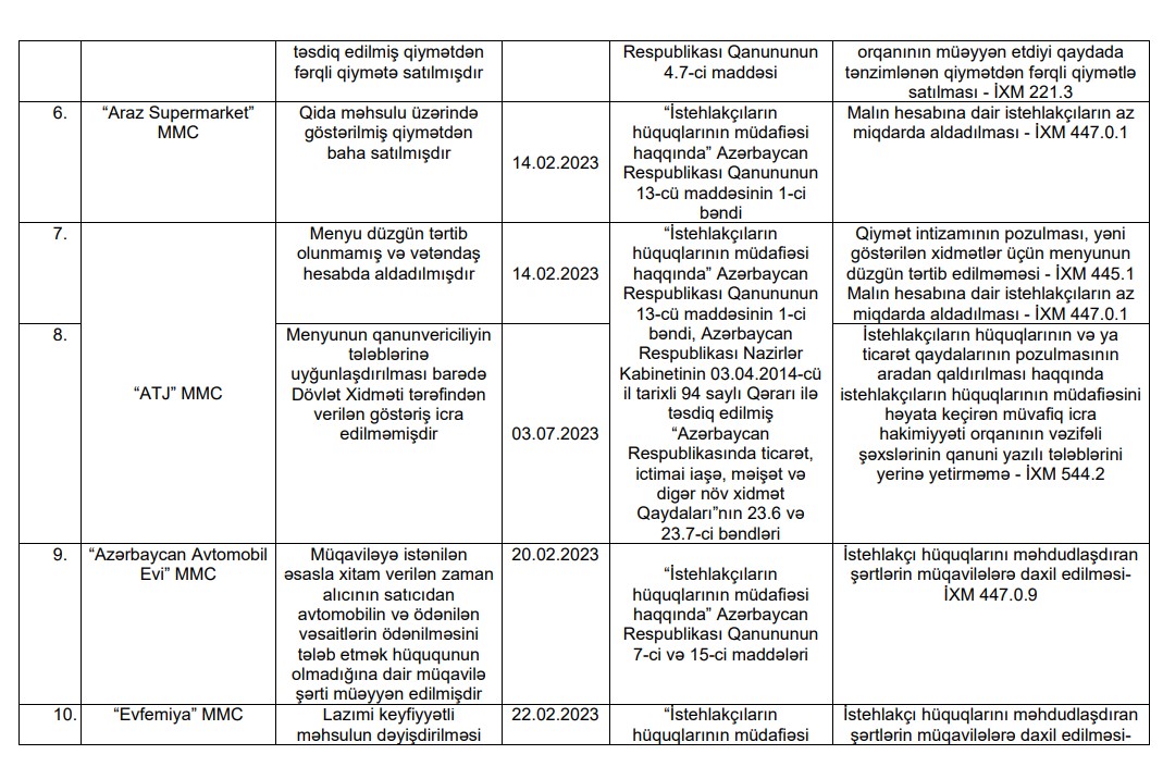 İnzibati xəta barədə protokollar 32 halda mal satan və ya əhaliyə xidmət göstərən şəxslər tərəfindən malın (xidmətin) ölçüsünə, çəkisinə, hesabına, habelə istehlak xüsusiyyətinə və ya keyfiyyətinə dair istehlakçıların az miqdarda aldadılması, 9 halda qanunvericilikdə nəzərdə tutulan hüquqlarla müqayisədə istehlakçının hüquqlarını məhdudlaşdıran şərtlərin müqaviləyə daxil edilməsi, 8 satılmış malların dəyişdirilməsi və ya geri qaytarılması qaydalarının pozulması, 6 halda istehlakçıların hüquqlarının və ya ticarət qaydalarının pozulmasının aradan qaldırılması haqqında istehlakçıların hüquqlarının müdafiəsini həyata keçirən müvafiq icra hakimiyyəti orqanının vəzifəli şəxslərinin qanuni yazılı tələblərini yerinə yetirməməsi, 4 halda dərman vasitəsinin Tarif (qiymət) Şurası tərəfindən müəyyən edilmiş qiymətdən fərqli qiymətə satılması, 4 halda ictimai iaşə müəssisəsində istehlakçılara təqdim olunan menyunun düzgün tərtib olunmaması, 1 halda istehlakçını maraqlandıran malın (işin, xidmətin) qiyməti, istehlak xassələri, əldə edilməsi şərtləri, təminat öhdəlikləri və iddiaların irəli sürülməsi, malın işlədilməsi, saxlanılması və təhlükəsiz istifadəsi üsulları və qaydaları barəsində satıcı (icraçı) tərəfindən istehlakçıya məlumatın verilməməsi əlaqədar tərtib edilib.