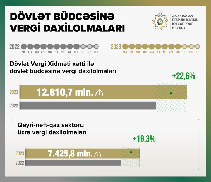 Bu müddətdə qeyri-neft-qaz sektorundan vergi daxilolmaları ötən ilin eyni dövrü ilə müqayisədə 19,3% artaraq 7 milyard 425,8 milyon manat olub.