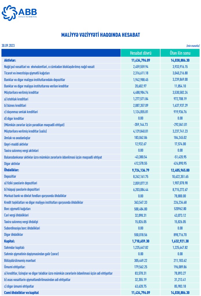 Qeyd edək ki, aktivlərinin həcminə görə Azərbaycanda ən böyük bank olan "ABB" ASC (Azərbaycan Beynəlxalq Bankı) 2023-cü ilin 9 ayını (yanvar-sentyabr) 250 milyon 866 min manat xalis mənfəətlə başa vurub. ABB-nin xalis mənfəəti 2023-cü ilin 9 ayında 2022-ci ilin eyni dövrü ilə müqayisədə 40 milyon 952 min manat və ya 19,5 % artıb.