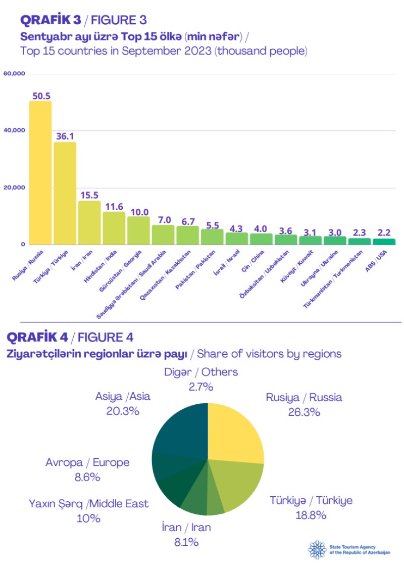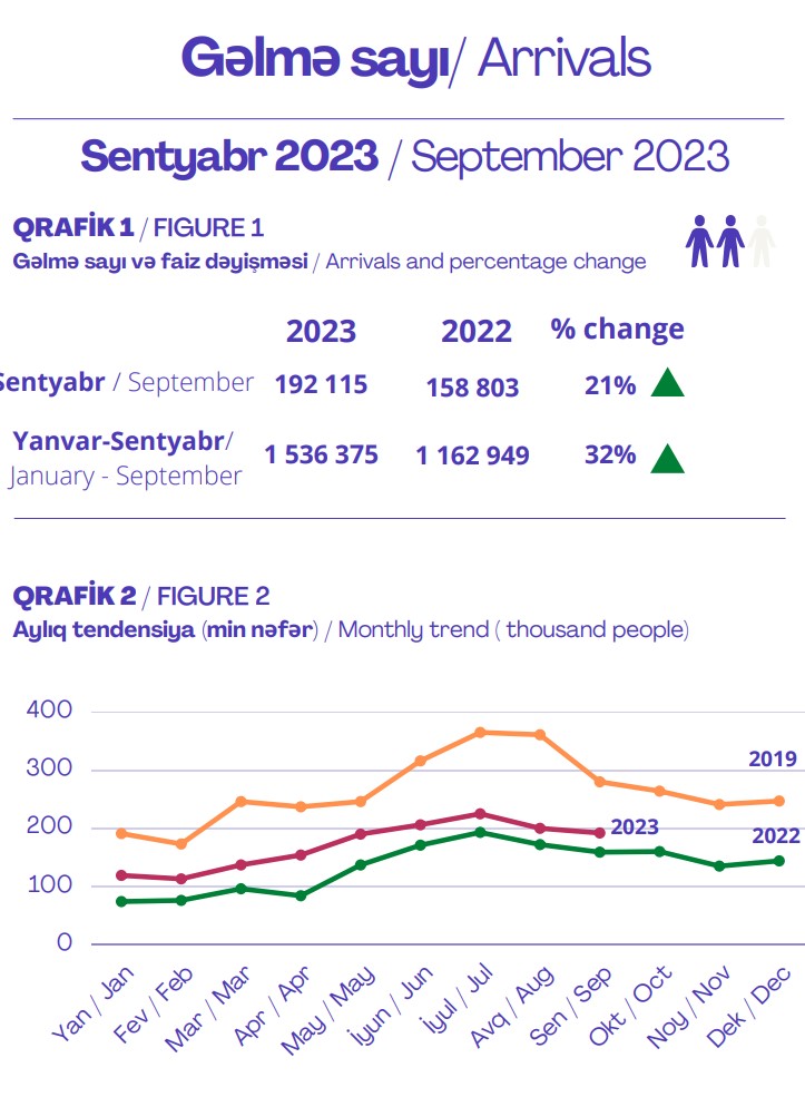 Azərbaycana gələnlərin sayı 2023-cü ilin 9 ayı ərzindən 1 milyon 536 min 375 nəfər, o cümlədən sentyabr ayında 192 min 115 nəfər təşkil edib.
