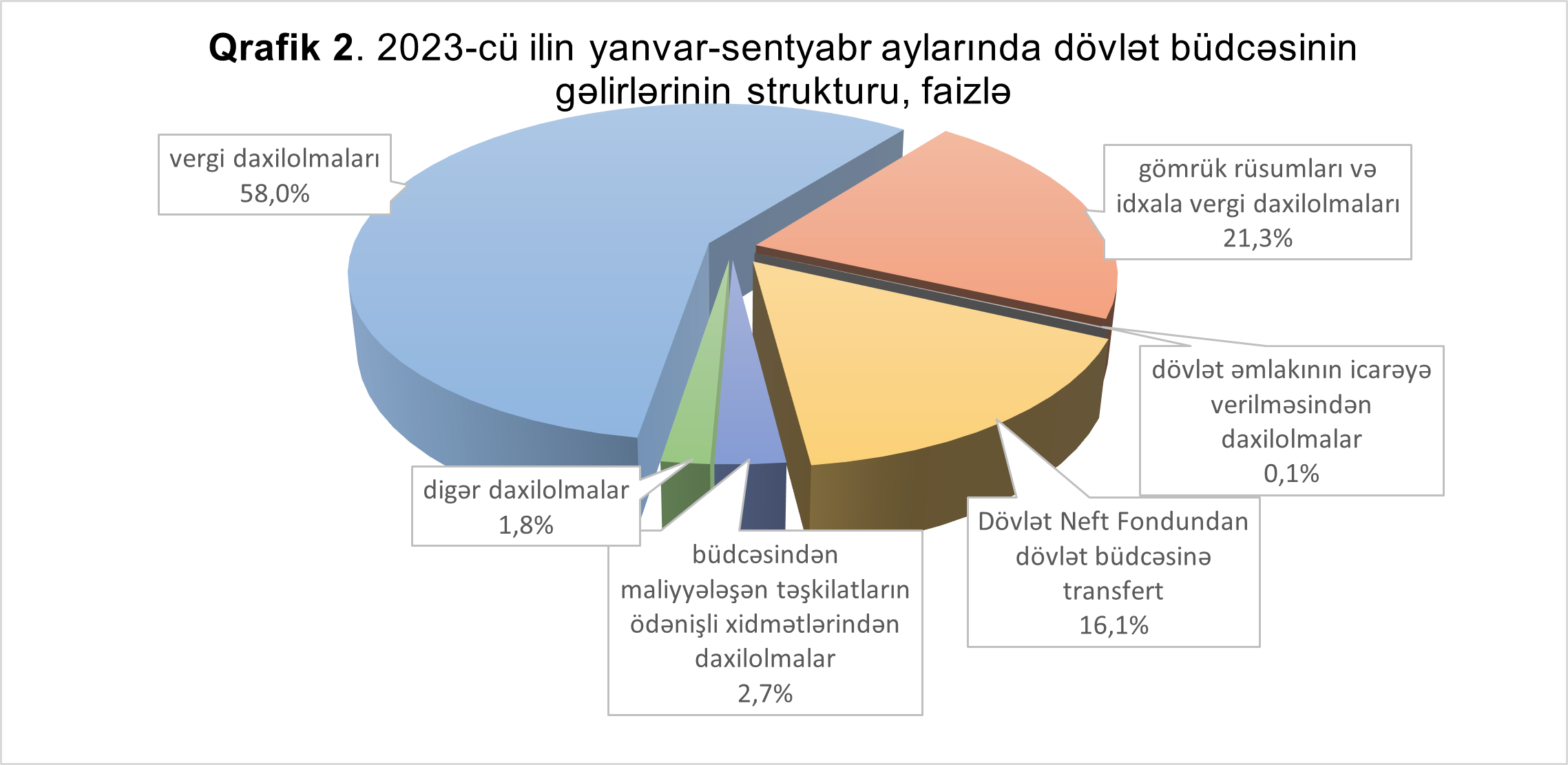 2023-cü ilin yanvar-sentyabr aylarında dövlət büdcəsinin daxilolmalarının 12 milyard 810,7 milyon manatı və ya 58,0 faizi vergi daxilolmalarının, 4 milyard 706,6 milyon manatı və ya 21,3 faizi gömrük rüsumları və idxala vergi daxilolmalarının, 3 milyard 550,0 milyon manatı və ya 16,1 faizi Azərbaycan Respublikasının Dövlət Neft Fondundan dövlət büdcəsinə transfertin, 582,2 milyon manatı və ya 2,7 faizi dövlət büdcəsindən maliyyələşən təşkilatların ödənişli xidmətlərindən daxilolmaların, 24,4 milyon manatı və ya 0,1 faizi dövlət əmlakının icarəyə verilməsindən daxilolmaların, 403,0 milyon manatı və ya 1,8 faizi isə digər daxilolmaların payına düşmüşdür.