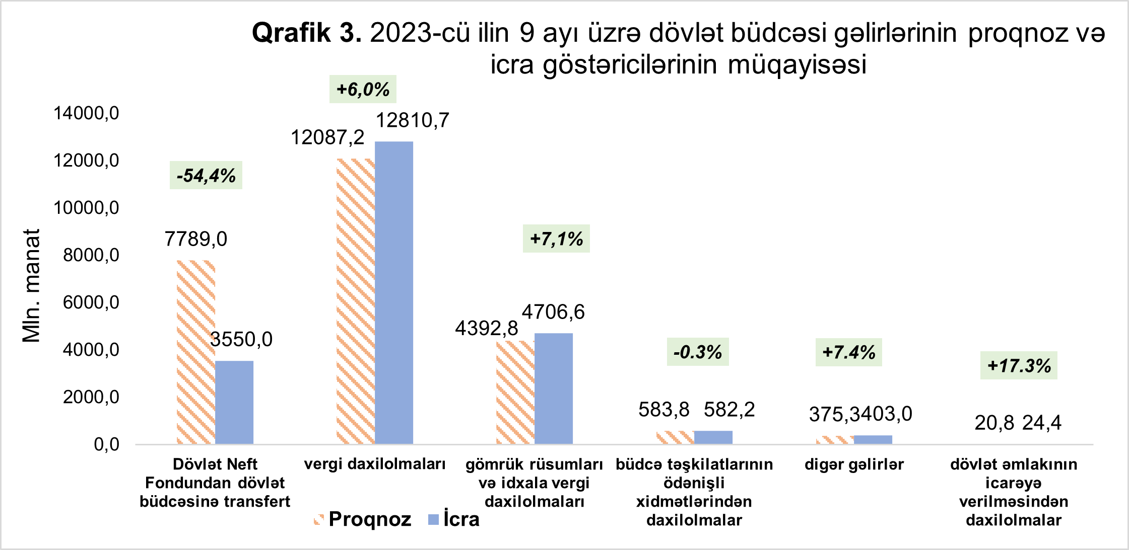 2023-cü ilin yanvar-sentyabr ayları ərzində dövlət büdcəsinin 9 aylıq gəlirləri üçün təsdiq edilmiş proqnozdan vergi daxilolmaları üzrə 723,5 milyon manat və ya 6,0 faiz çox, gömrük rüsumları və idxala görə vergi daxilolmaları üzrə 313,8 milyon manat və ya 7,1 faiz çox, dövlət əmlakının icarəyə verilməsindən daxilolmalar üzrə 3,6 milyon manat və ya 17,3 faiz çox, digər daxilolmalar üzrə 27,7 milyon manat və ya 7,9 faiz çox daxilolmaların təmin edilməsinə nail olunmuşdur. Dövlət büdcəsindən maliyyələşən təşkilatların ödənişli xidmətlərin göstərilməsi üzrə dövlət büdcəsinə 582,2 milyon manat vəsait daxil olmuşdur ki, bu da proqnozla müqayisədə 1,6 milyon manat və ya 0,3 faiz azdır.