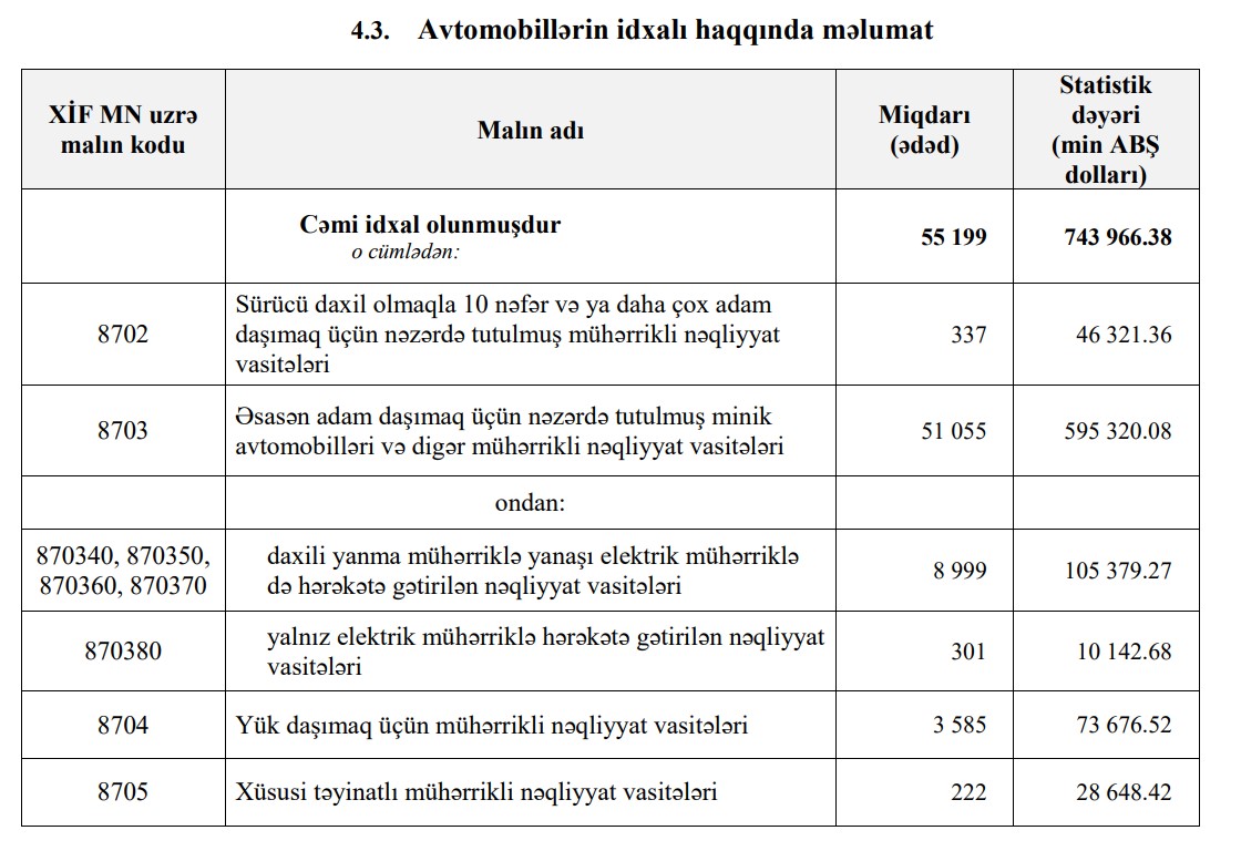 2022-ci ilin 9 ayında Azərbaycan 743 milyon 966 min dollar dəyərində 55 min 199 ədəd avtomobil idxal edilmişdi.