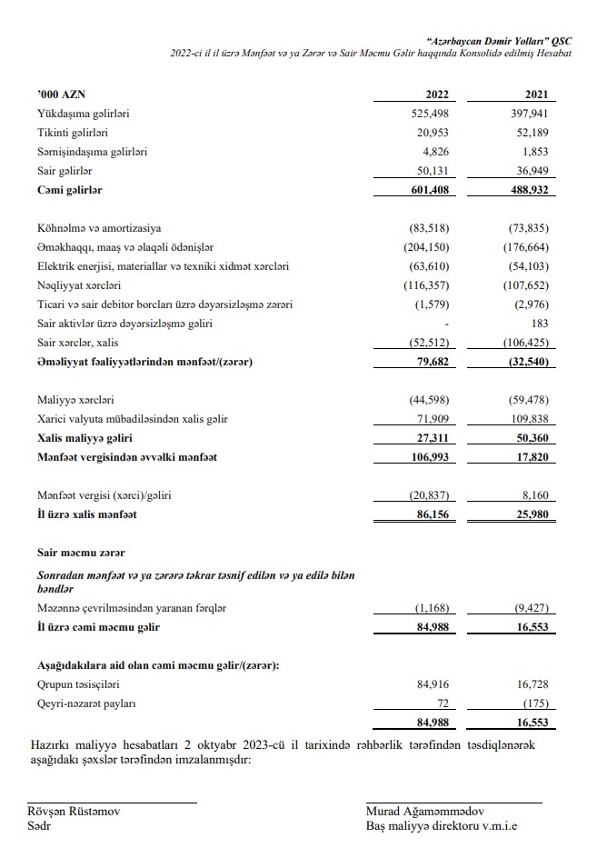 “Azərbaycan Dəmir Yolları”nın xalis mənfəəti 3,2 dəfə artıb.“Azərbaycan Dəmir Yolları” QSC 2022-ci ili 86 milyon 156 min manat xalis mənfəət ilə başa vurub. Dövlət şirkəti 2021-ci ili 25 milyon 980 min manat xalis mənfəət ilə bağlamışdı. Beləliklə, ötən il “Azərbaycan Dəmir Yolları”nın xalis mənfəəti 3,3 dəfə artıb. Xalis mənfəətin artması gəlirlərin artmasından, həmçinin xərclərin azalmasından qaynaqlanır.