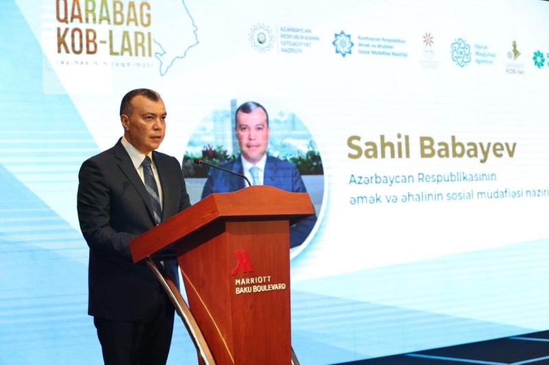 Əmək və əhalinin sosial müdafiəsi naziri Sahil Babayev işğaldan azad olunmuş ərazilərimizdə icra olunan aktiv məşğulluq proqramlarını qeyd edərək, bu ərazilərə köçürülən sakinlərdən əmək qabiliyyətli olanların təqribən 70%-nin artıq məşğulluğunun təmin edildiyini bildirib. Qeyd olunub ki, postmüharibə dövründə şəhid ailələri və müharibə iştirakçıları ilə bağlı icra olunan sosial dəstək paketi çərçivəsində bu kateqoriyalardan olan 20 min şəxsin məşğulluğu təmin edilib, habelə 11 minə yaxın şəxs özünüməşğulluq proqramına cəlb edilib, təqribən 10 minədək şəxs işlə təmin olunub. Nazir son 5 ildə 1 milyondan çox şəxsin məşğulluq tədbirləri ilə əhatə olunduğunu bildirib, “Qarabağ KOB”ları layihəsinin şəhid ailələri və müharibə iştirakçılarının sosial rifahı və məşğulluğunun dəstəklənməsində əhəmiyyətli olacağını vurğulayıb.