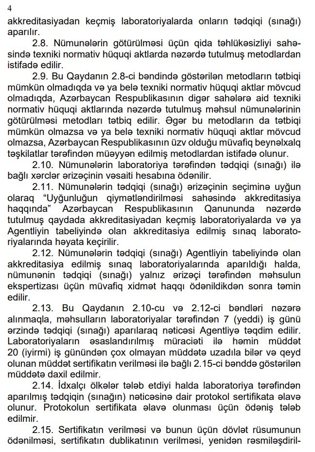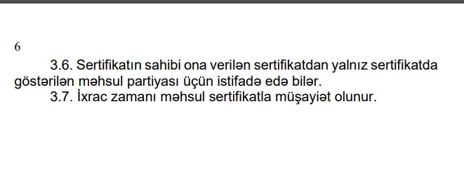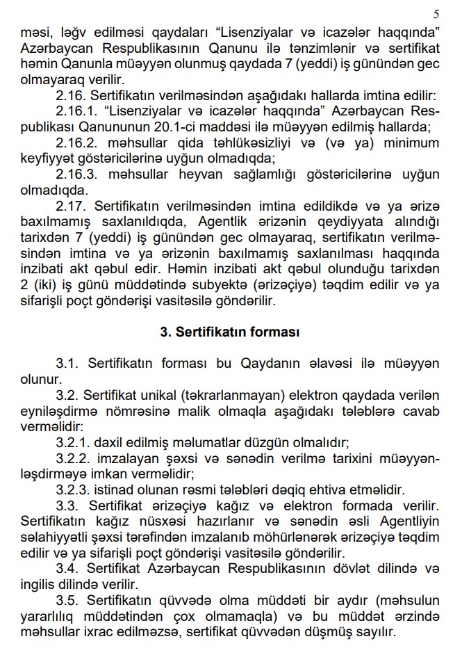Qaydaya görə, məhsullara idxalçı ölkələr tələb etdiyi hallarda Azərbaycan Qida Təhlükəsizliyi Agentliyi tərəfindən idxalçı ölkələrin tələbləri nəzərə alınmaqla sağlamlıq sertifikatı verilir. İdxalçı ölkələr tələb etdiyi hallarda Agentlik tərəfindən ixrac olunan heyvan mənşəli qida məhsullarına verilən sağlamlıq sertifikatı həmin məhsulların qida təhlükəsizliyi göstəriciləri ilə yanaşı, “Baytarlıq haqqında” Azərbaycan Respublikasının Qanununa əsasən heyvan sağlamlığı göstəricilərinə uyğunluğunu da təsdiq edə bilər.