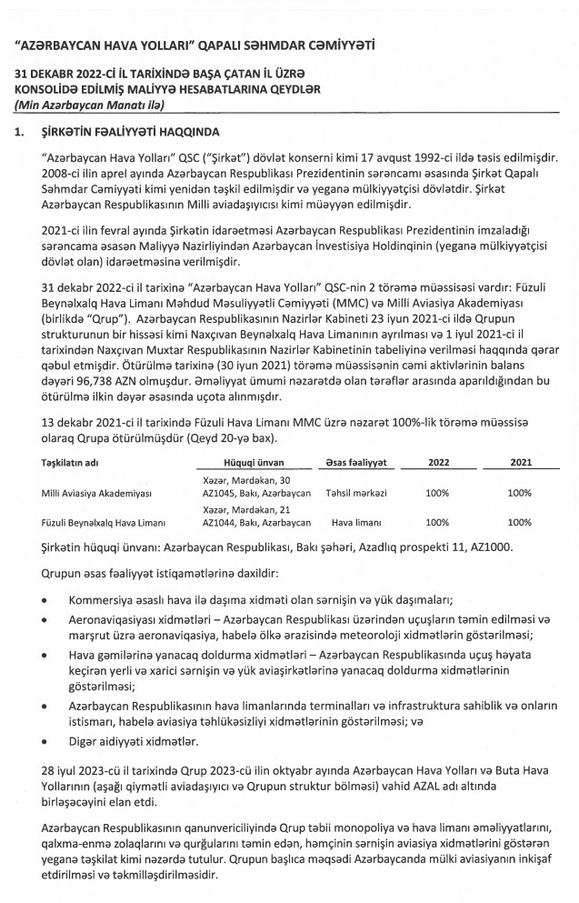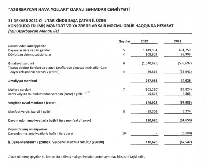 Biletlərinin baha olmasına görə tez-tez tənqid olunan "Azərbaycan Hava Yolları" QSC (AZAL) 2022-ci ili 110 milyon 620 min manat xalis mənfəət ilə başa vurub. Dövlət aviaşirkəti 2021-ci ili 67 milyon 547 min manat xalis zərər ilə bağlamışdı. Beləliklə, ötən il AZAL zərərdən mənfəətə keçib. AZAL-ın xalis zərəri 2019-cu ili 78 milyon 770 min manat, 2020-ci ili isə 76 milyon 415 min manat təşkil etmişdi.