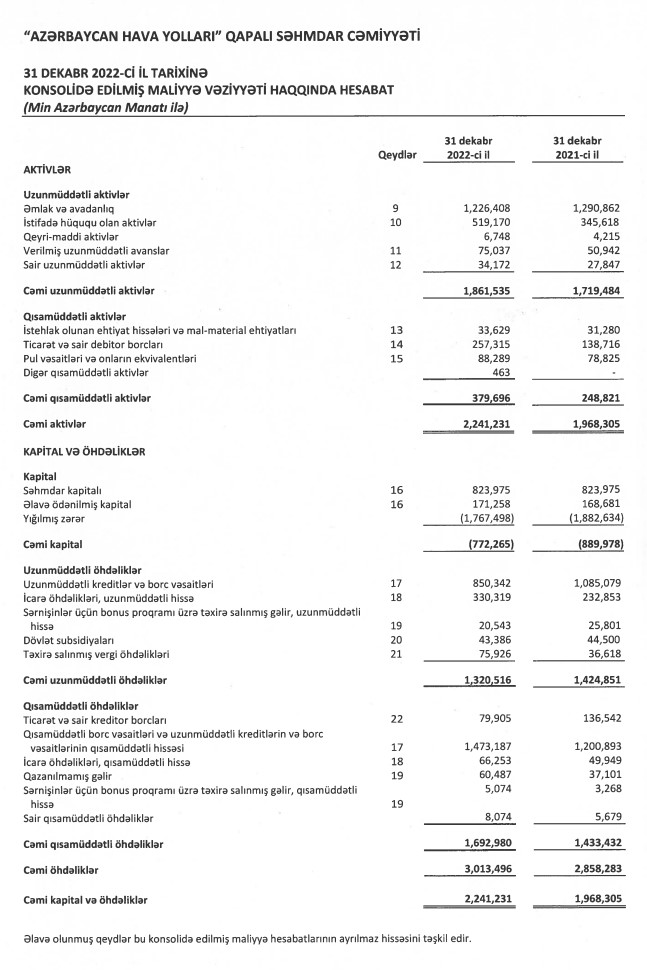 31 dekabr 2022-ci il tarixində AZAL 2 milyard 241 milyon 231 min manat cəmi aktivlərə malik olub. Aviaşirkət 2021-ci ilin sonunda 1 milyard 968 milyon 305 min manat cəmi aktivlərə malik idi.
