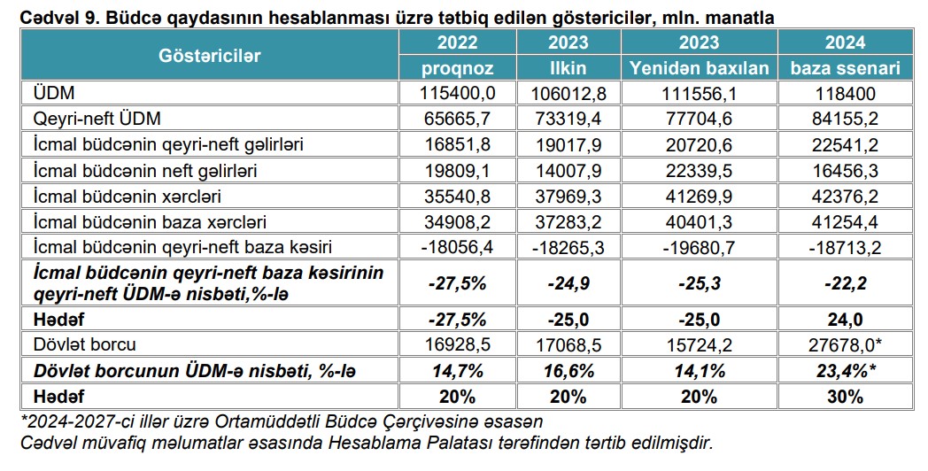 Qeyd edilib ki, “2024-2027-ci illər üzrə Ortamüddətli Büdcə Çərçivəsi”nin əlavəsinə əsasən dövlət borcu 2023-cü ilin sonuna 26 mlrd. 803,6 mln. manat və 2024-cü il üçün 27 mlrd. 678,0 mln. manat proqnozlaşdırılmışdır ki, bu da ÜDM-in müvafiq olaraq 22,4% və 23,4%-ni təşkil etməklə müvafiq fiskal çərçivə daxilində olduğunu göstərir.