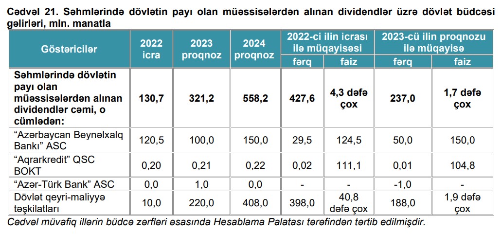 Qeyd edilib ki, səhmlərində dövlətin payı olan müəssisələrdən alınan dividendlər üzrə daxilolmalar 2024-cü ilin dövlət büdcəsi layihəsində 558,2 mln. manat nəzərdə tutulmuşdur ki, bu da 2023-cü ilin proqnoz göstəricisindən 237,0 mln. manat və ya 1,7 dəfə çoxdur. Artımın əsas səbəbi dövlət qeyri-maliyyə təşkilatları üzrə dividend ödənişlərinin 188,0 mln. manat artırılaraq 408,0 mln. manat və "Azərbaycan Beynəlxalq Bankı” ASC üzrə 50,0 mln. manat artırılaraq 150,0 mln. manat nəzərdə tutulması ilə əlaqədar olmuşdur